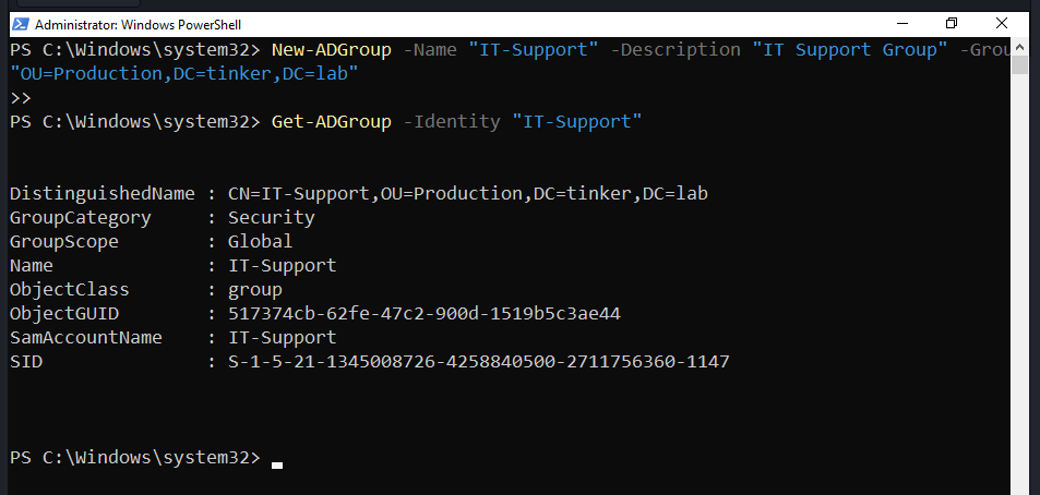 New-ADGroup -Name "IT-Support" -Description "IT Support Group" -GroupScope "Global" -Path "OU=Production,DC=tinker,DC=lab"