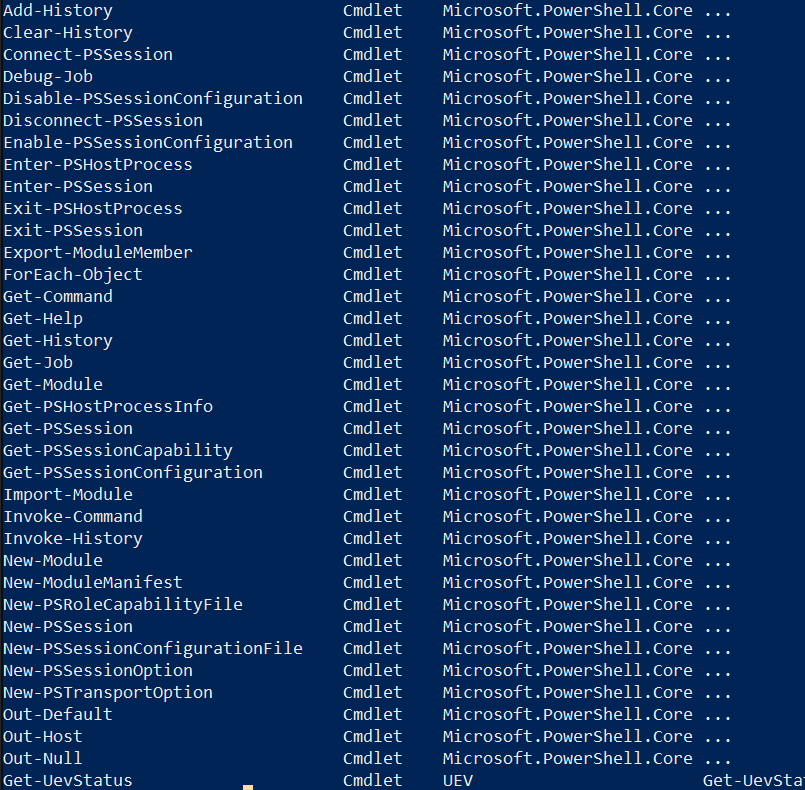 Good news — you don’t need to memorize all cmdlets. You can list all cmdlets by executing the Get-Help -Category Cmdlet, which will return the following: