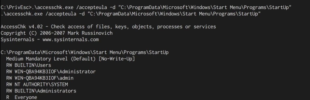 accesschk.exe /accepteula -d "C:\ProgramData\Microsoft\Windows\Start Menu\Programs\StartUp"